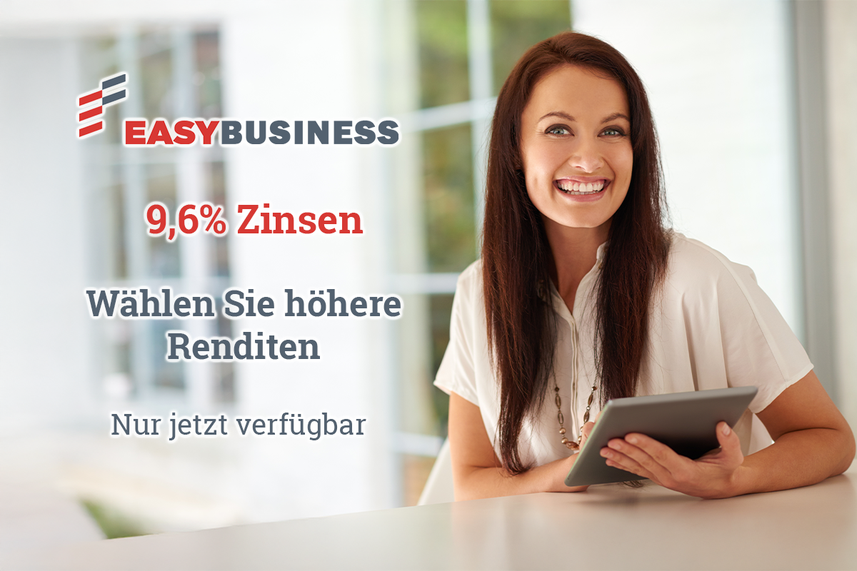 Nur jetzt! Easy Business bietet Ihnen 9,6 % Jahreszinsen auf Basis von Forderungen aus Darlehen, die über den iuvo-Marktplatz abgewickelt werden.
